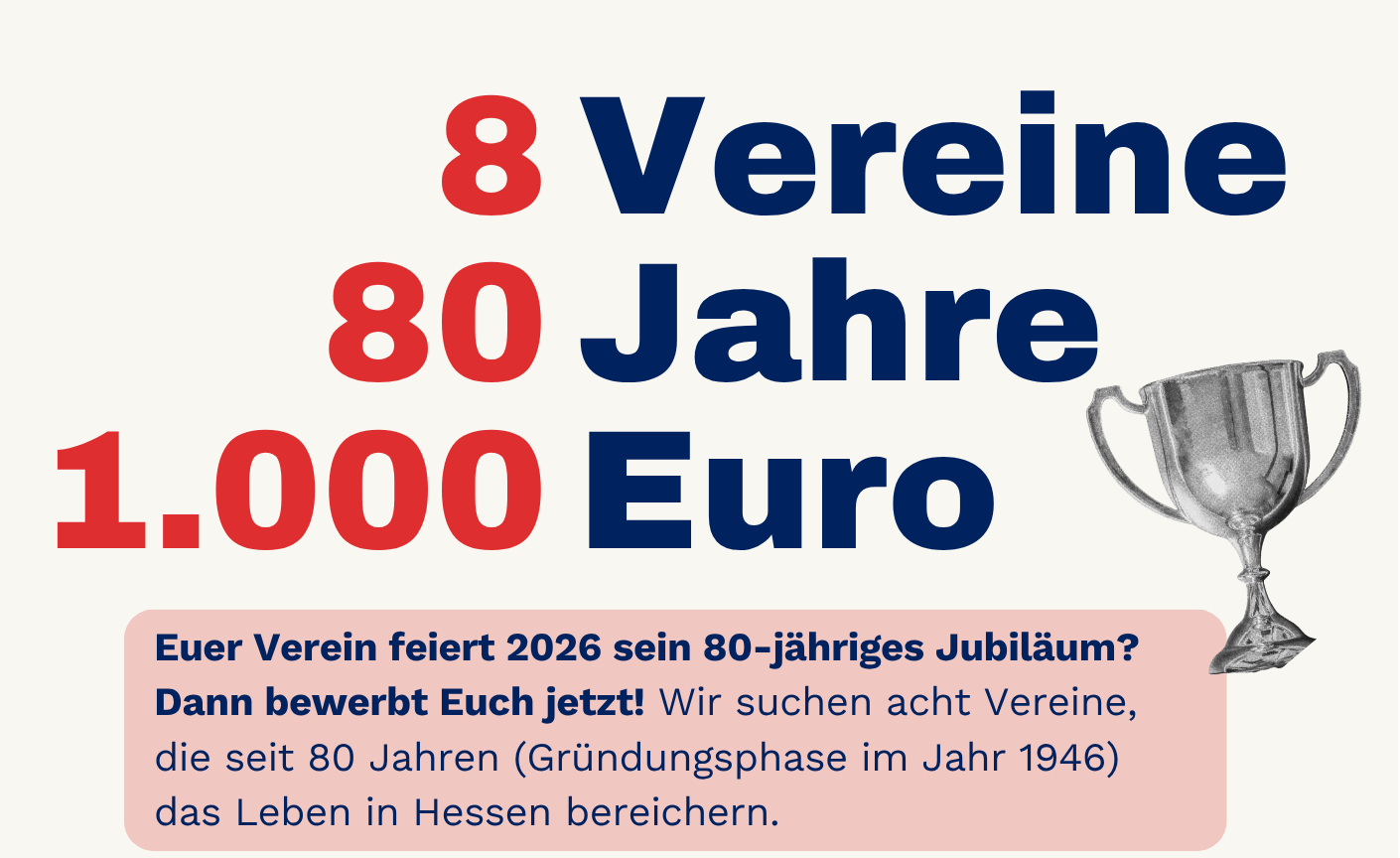 80 Jahre Hessen – 80 Jahre Engagement, das verbindet! Wenn auch euer Verein in diesem Jahr sein 80-jähriges Bestehen feiert, dann nutzt die Chance: Bewerbt euch bis zum 10. Mai und zeigt uns, was euren Verein einzigartig macht! Denn wir möchten 8 Vereine auszeichnen, die seit 80 Jahren (Gründungsphase im Jahr 1946) das Leben in Hessen bereichern.