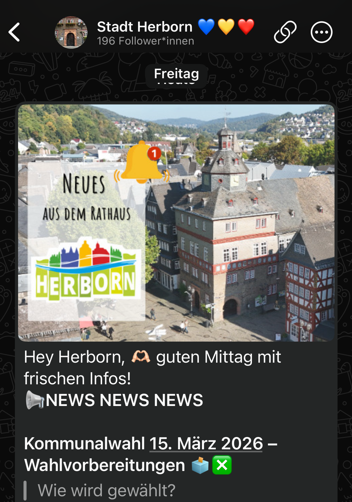 Wer die Glocke aktiviert, erhält neue Push-Meldungen der Stadtverwaltung wie eine WhatsApp-Nachricht direkt auf das Handy. Die Stadt Herborn setzt mit dem WhatsApp-Kanal ein weiteres Zeichen für moderne und bürgernahe Kommunikation. Auf dem WhatsApp-Kanal der Stadt Herborn erhalten Interessierte kurze, prägnante Nachrichten zu aktuellen Themen aus der Stadtverwaltung, wichtige Mitteilungen und Terminhinweise. Inhaltlich handelt es sich um die gleichen Meldungen, die auch auf der städtischen Internetseite sowie auf Instagram und Facebook veröffentlicht werden. Die Abmeldung ist jederzeit unkompliziert mit nur einem Klick möglich.