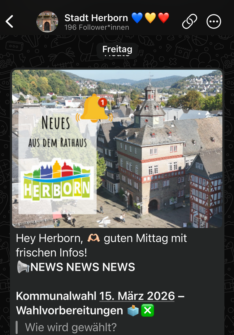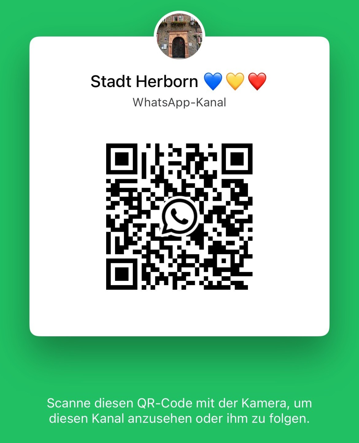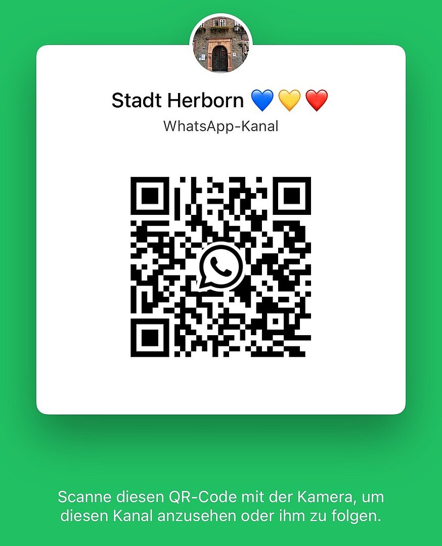 Folge dem Kanal Stadt Herborn auf WhatsApp, einfach den Kanal abonnieren und keine wichtigen Informationen mehr verpassen.