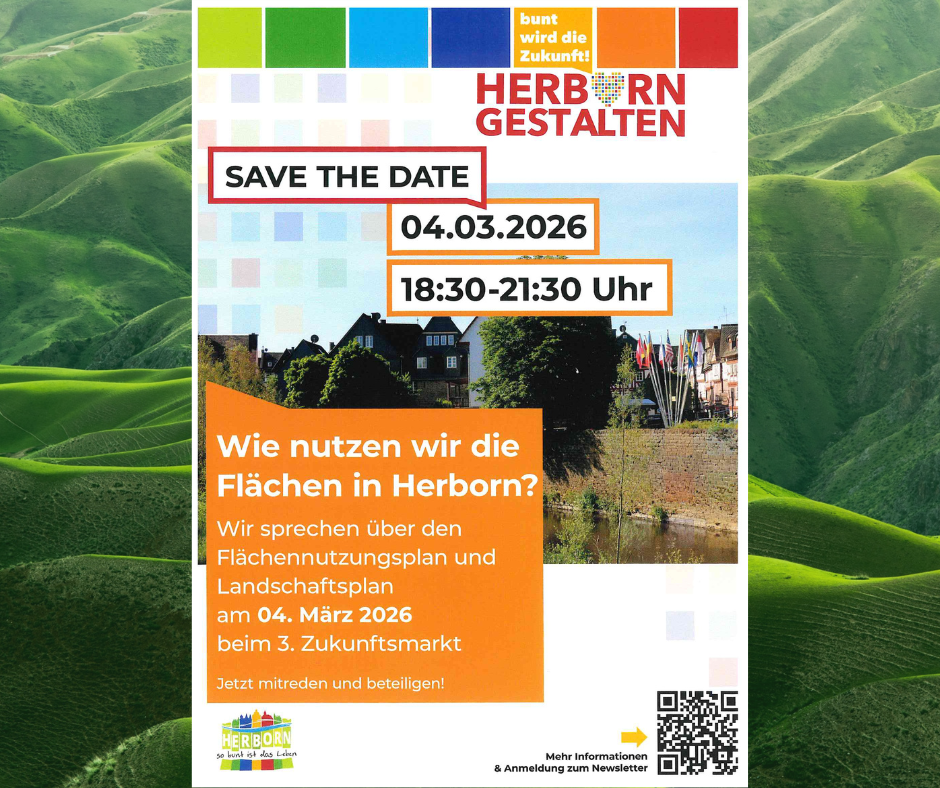 Die Bürgerbeteiligung zu den Integrierten Planwerken geht in die nächste Runde. Am Mittwoch, 4. März 2026, von 18:30 bis 21:30 Uhr lädt die Stadt Herborn zum dritten Zukunftsmarkt ins Bürgerhaus Burg ein. Unter dem Motto „Wie nutzen wir die Flächen in Herborn?“ steht diesmal der Flächennutzungsplan (FNP) und der Landschaftsplan (LP) im Mittelpunkt. Das Planungsbüro Fischer stellt beide Planwerke kompakt vor und erläutert, welche Weichen damit für die künftige Stadtentwicklung gestellt werden.