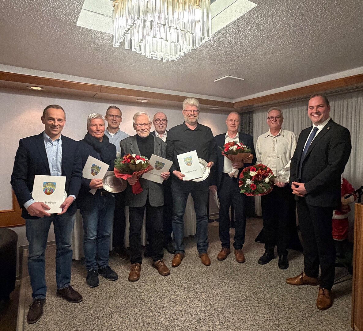 Die Stadtverordnetenversammlung Herborn ehrte in ihrer letzten Sitzung des Jahres wieder Persönlichkeiten, die sich in herausragender Weise für das Gemeinwohl und das Ansehen der Stadt eingesetzt haben. Basierend auf der Satzung über die Ehrung verdienter Persönlichkeiten und über die Würdigung hervorragender Leistungen im Bereich des Sports verleiht die Stadt Herborn eine Ehrenmedaille sowie sechs Ehrenteller. „Unsere Stadtgesellschaft lebt vom Miteinander und Füreinander. Das Ehrenamt in den Vereinen unserer Stadt ist so vielfältig wie unsere Gesellschaft. Deshalb freue ich mich, dass heute sieben Menschen für verschiedensten Leistungen ausgezeichnet werden. Sie engagieren sich seit Jahrzehnten ehrenamtlich im Sport und Sozialbereich und sind Vorbilder des gelebten Gemeinsinns“, unterstrich Herborns Bürgermeister Lukas Winkler. Stadtverordnetenvorsteher J. Michael Müller sagte: „Die heute geehrten Persönlichkeiten sind ein Beispiel für das bürgerschaftliche Engagement, das unsere Stadt auszeichnet. Wir schätzen Ihren Einsatz für das Gemeinwohl und die Gemeinschaft sehr und ehren Sie dafür.“