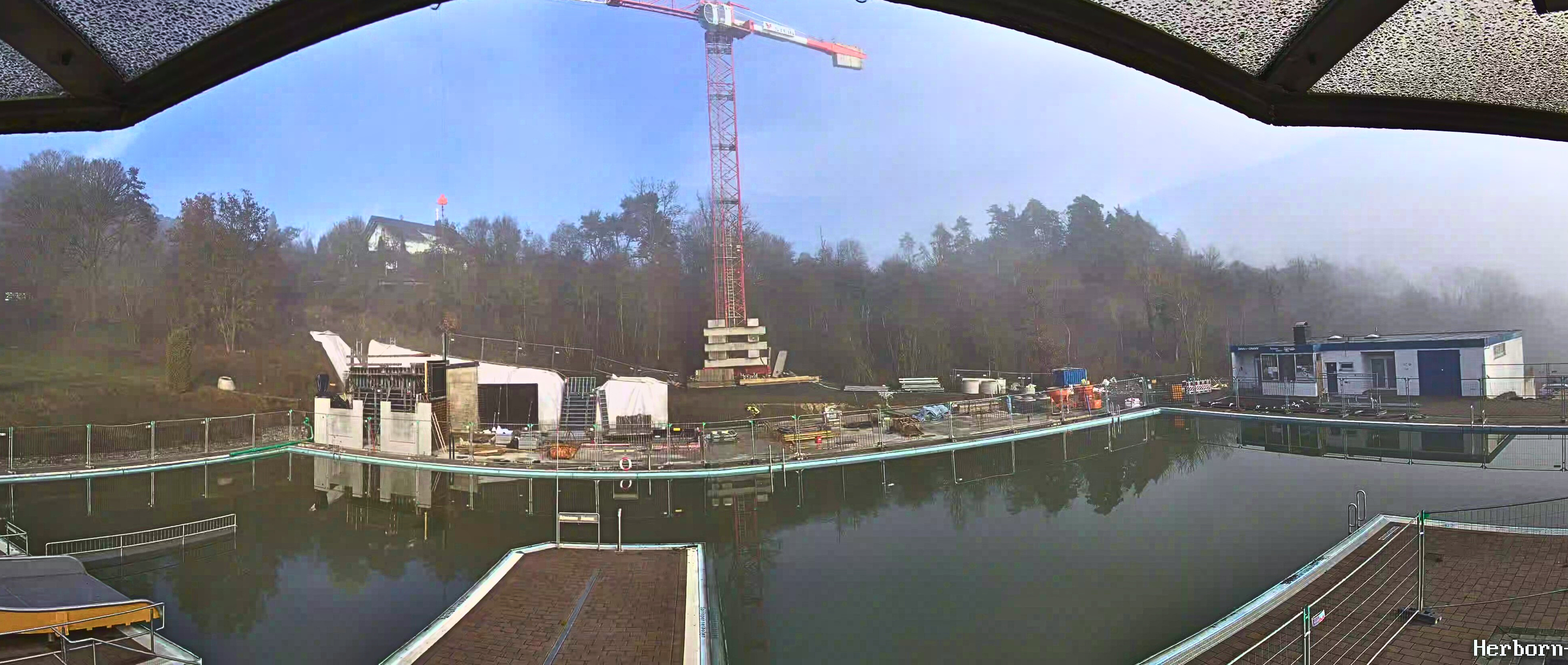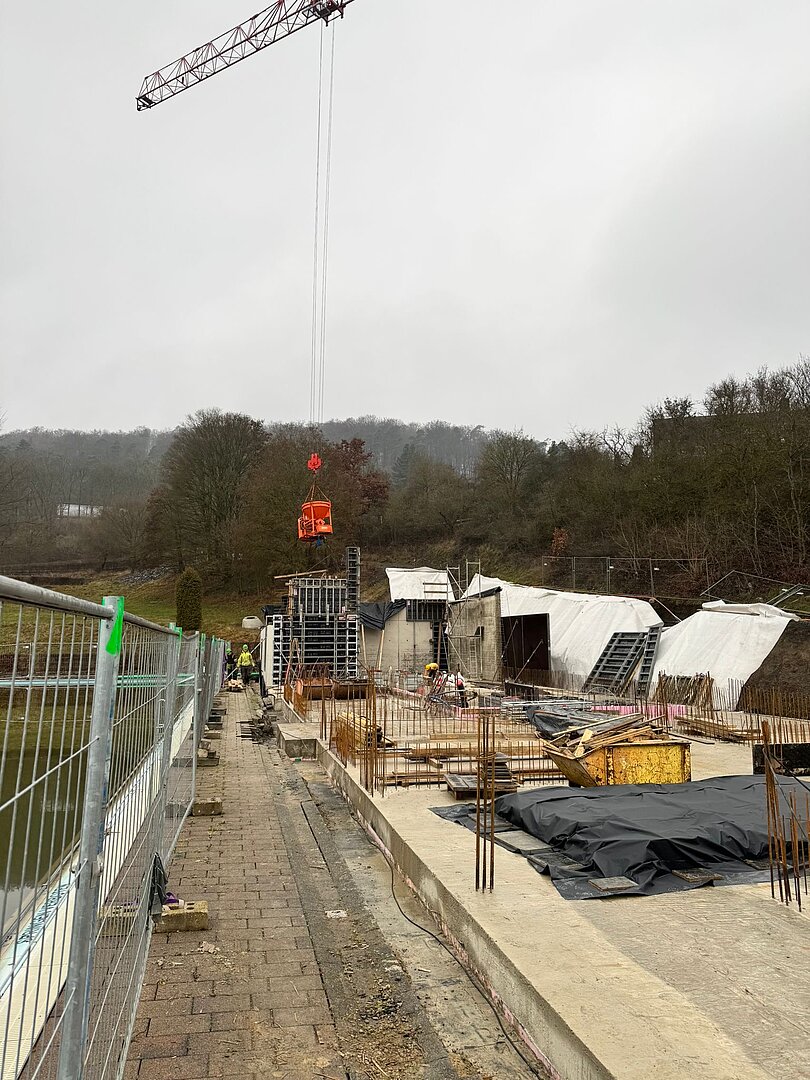 Schon von Weitem ist der 70 Meter hohe Baukran ein sichtbares Zeichen für die umfassende Sanierung des Freibads. Wer regelmäßig einen Blick auf das Gelände wirft, dem ist sicherlich aufgefallen, wie viel sich in den vergangenen knapp 400 Tagen auf dem Freibadgelände verändert hat. Im November 2024 fiel mit dem Spatenstich der Startschuss zur Sanierung. Aktuell wird der Rohbau des neuen Funktionsgebäudes errichtet. Die Außenwände des Funktionsgebäudes werden aktuell nach umfassender Hangsicherung aus Sichtbeton und Betonfertigteilen errichtet. Soweit die Witterung es erlaubt, wird auf der Baustelle auch in den Wintermonaten tatkräftig weitergearbeitet.