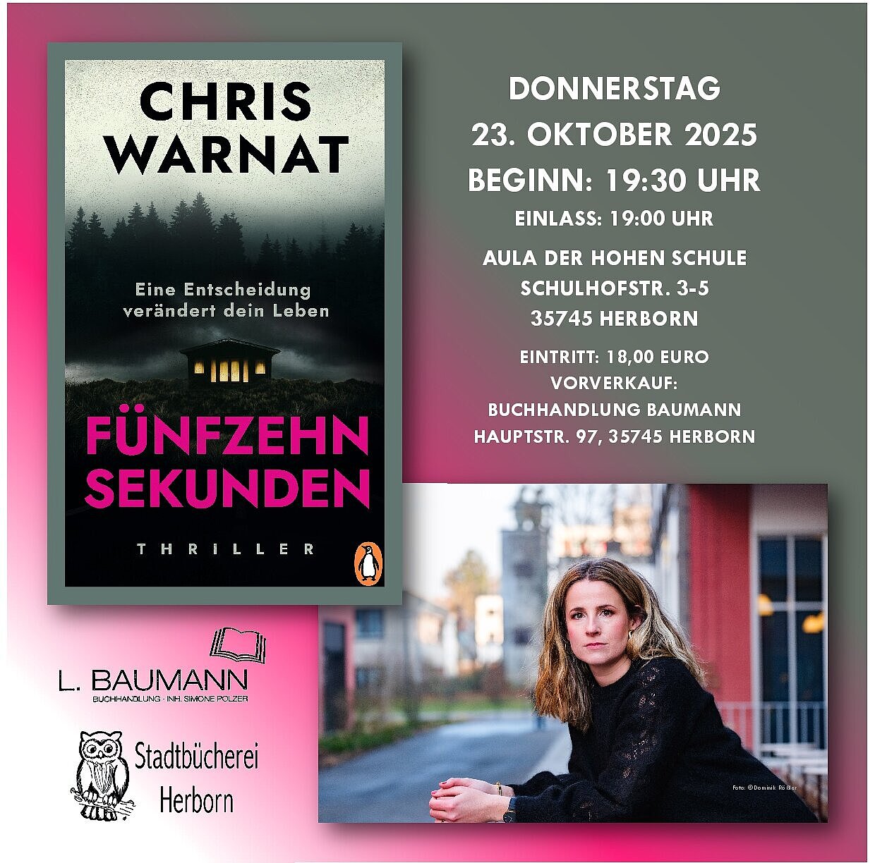 Wenn aus einer alltäglichen Heimfahrt ein Albtraum wird und jede Sekunde zählt, dann steckt man mitten in der Handlung von „Fünfzehn Sekunden“. Am Donnerstag, den 23. Oktober 2025, lädt die Stadtbücherei Herborn gemeinsam mit der Buchhandlung Baumann zu einer fesselnden Lesung mit der Autorin Chris Warnat in die Aula der Hohen Schule Herborn, Schulhofstraße 3-5, ein. Beginn ist um 19:30 Uhr, Einlass ab 19:00 Uhr. Eintrittskarten sind im Vorverkauf bei der Buchhandlung Baumann, Hauptstraße 97, zum Preis von 18 Euro erhältlich.