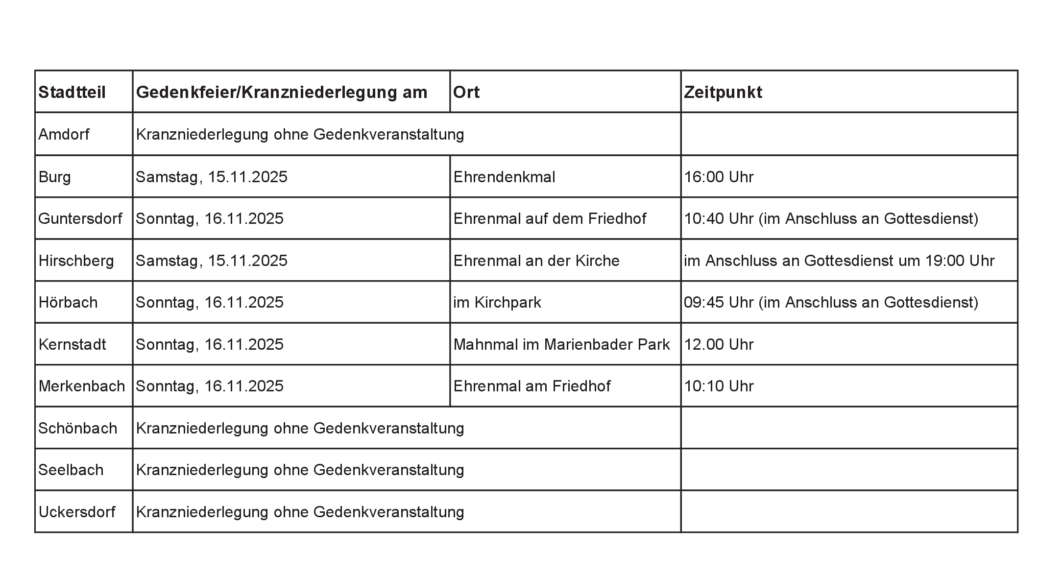 Auch in den Stadtteilen Herborns finden am Volkstrauertag oder bereits einen Tag zuvor Kranzniederlegungen und Gedenkfeiern statt. Die Termine sind der Übersicht im Anhang zu entnehmen.