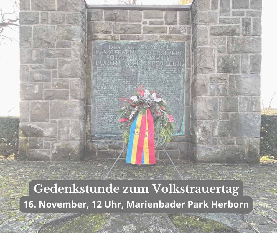 Am Sonntag, 16. November 2025, finden in Herborn und den Stadtteilen Gedenkfeiern zum Volkstrauertag statt. Die Stadt Herborn lädt alle Bürgerinnen und Bürger herzlich ein, an den Gedenkveranstaltungen teilzunehmen und gemeinsam der Opfer von Krieg und Gewalt zu gedenken. Die zentrale Gedenkfeier beginnt um 12 Uhr im Marienbader Park, Schlossstraße Herborn. Im Mittelpunkt stehen eine Ansprache des Bürgermeister Lukas Winkler sowie des Pfarrers Simon Schade von der Katholischen Pfarrei „Zum guten Hirten an der Dill“, musikalische Beiträge und die traditionelle Kranzniederlegung. Die Veranstaltung steht unter dem Motto des diesjährigen Volkstrauertags, der an das Ende des Zweiten Weltkriegs vor 80 Jahren erinnert und an die Folgen von Krieg und Gewalt mahnt. „Der Volkstrauertag ist ein Tag des stillen Gedenkens und der gemeinsamen Verantwortung“, so Bürgermeister Winkler. „Ich lade alle Bürgerinnen und Bürger ein, an den Veranstaltungen teilzunehmen und gemeinsam ein Zeichen für Frieden und Versöhnung zu setzen.“