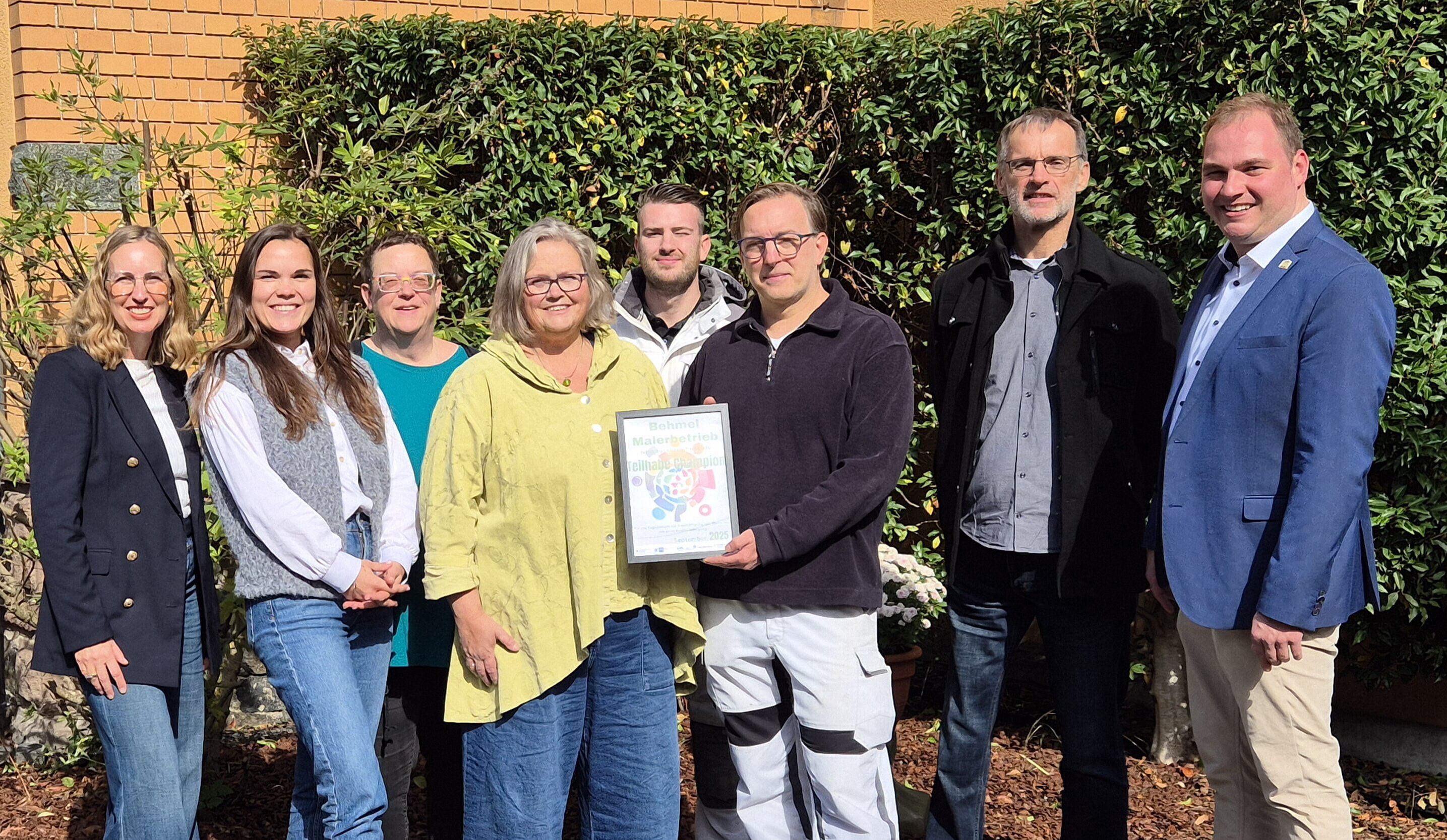 Der Malerbetrieb Frank Behmel wurde im September 2025 mit dem Titel "Teilhabechampion" ausgezeichnet. Der Familienbetrieb erhält die Ehrung für sein herausragendes Engagement bei der Integration von Menschen mit Schwerbehinderung in die Arbeitswelt. Die Urkunde wurde im feierlichen Rahmen von Vertretern aus Politik, Wirtschaft und sozialen Einrichtungen überreicht, darunter der Herborner Bürgermeister Lukas Winkler, Monika Mundt von der Einheitlichen Ansprechstelle für Arbeitgeber (EAA), Dirk Köhler von der Agentur für Arbeit (AfA) sowie Claudia Wagner von der Industrie- und Handelskammer (IHK), Jenny Truhöl von der Handwerkskammer Wiesbaden und Susanne Eiben, Inklusionsbeauftrage beim Lahn-Dill-Kreis.