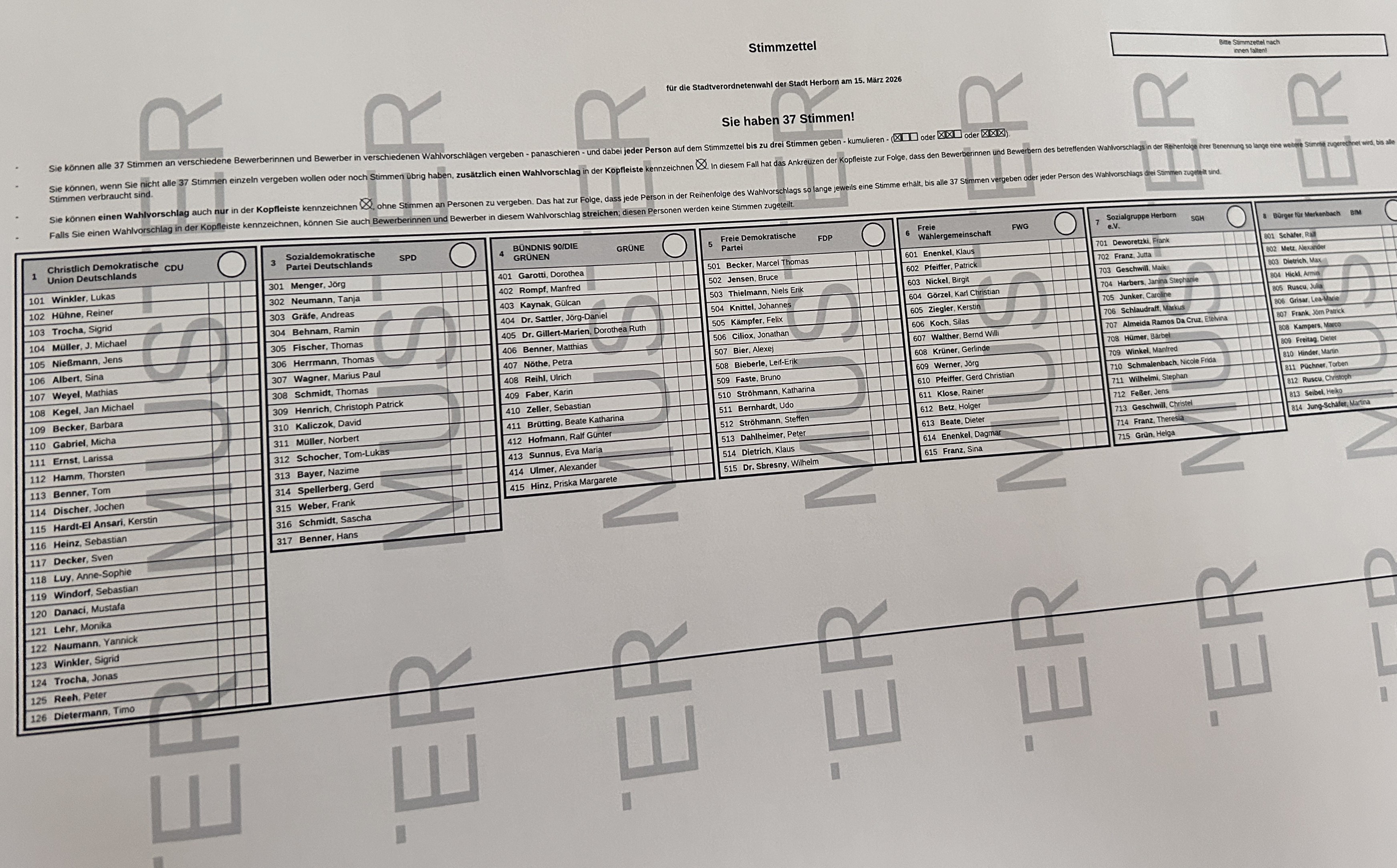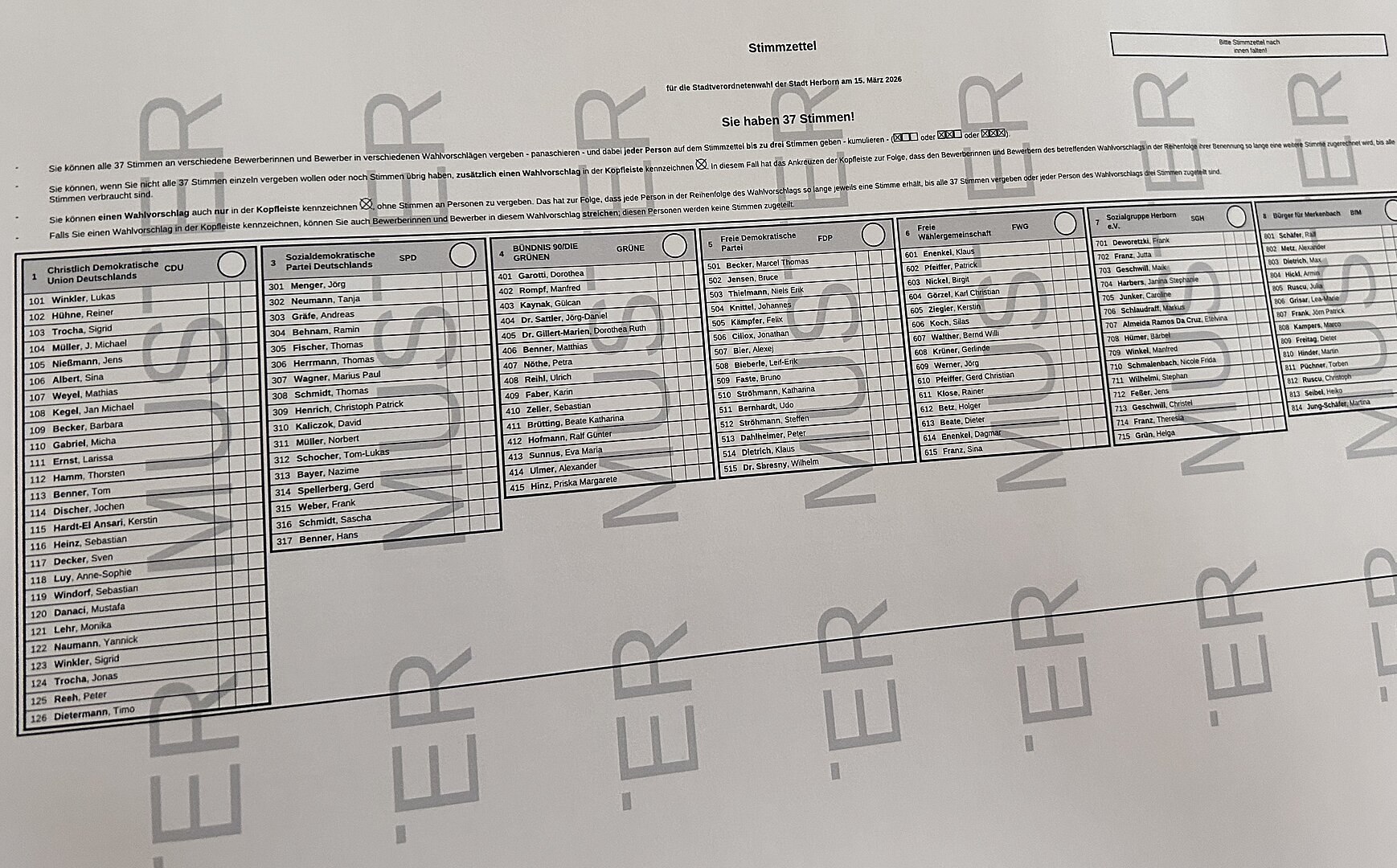 Um den Wahlvorgang transparent und verständlich zu machen, stellt die Stadt Herborn ab sofort interaktive Musterstimmzettel auf ihrer Homepage zur Verfügung. Interessierte Wählerinnen und Wähler können dort testen, wie die Vergabe von Stimmen für Listen und einzelne Kandidaten auf dem Stimmzettel funktioniert. Das Angebot ermöglicht es, sich spielerisch mit dem Wahlsystem vertraut zu machen und die Auswirkungen der eigenen Stimmabgabe nachzuvollziehen.