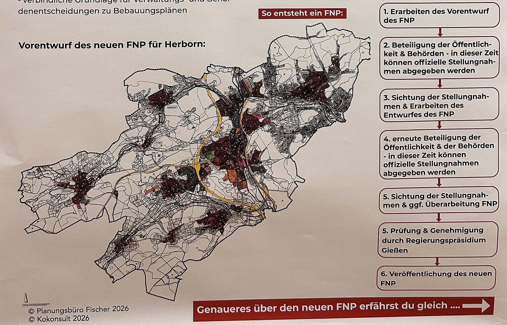 1. Informieren: Ab dem 8. April 2026 bis 22. Mai 2026 stehen die Planunterlagen des Vorentwurfs inklusive Begründung zur Einsicht bereit. Online: www.herborn.de/oeffentliche-Bekanntmachungen und bauleitplanung.hessen.de sowie vor Ort in der Stadtverwaltung Herborn, Turmstraße 14–16, Zimmer 102 (FB 4 Bauen, Stadtentwicklung und Wirtschaftsförderung)