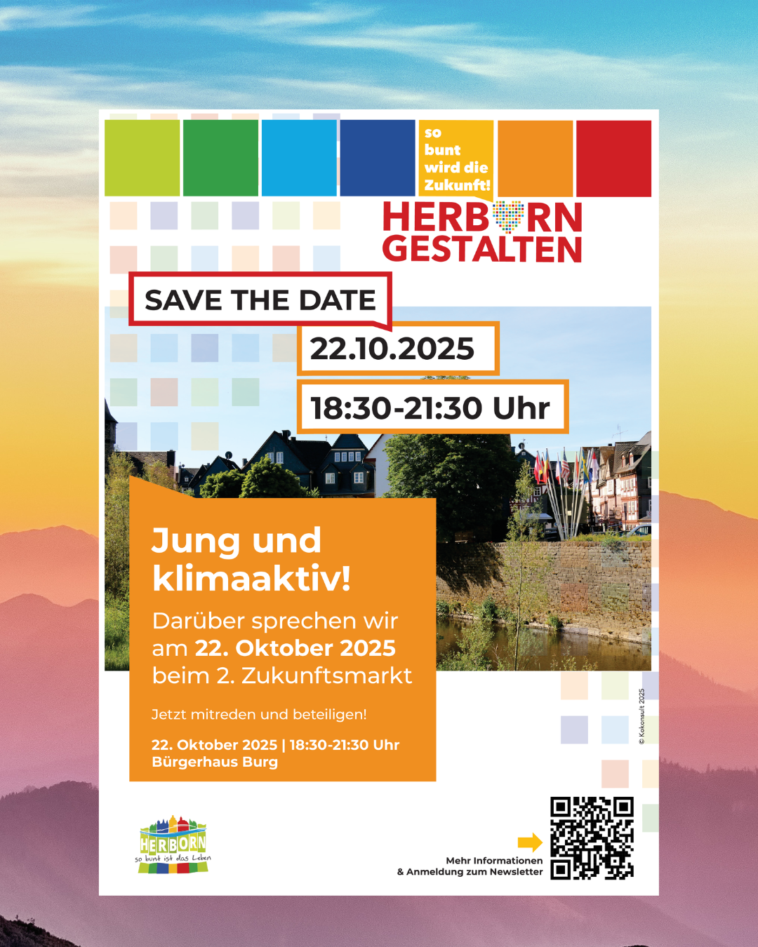 Wie geht es weiter? Beim 2. Zukunftsmarkt können Herbornerinnen und Herborner am 22. Oktober 2025 um 18:30 Uhr im Bürgerhaus Burg wieder ihre Ideen zur Stadtentwicklung einbringen. Thematisch befasst sich der 2. Zukunftsmarkt unter dem Motto „Jung und klimaaktiv“ mit dem Schwerpunkt Klimaanpassung und -schutz. Anregungen fließen in das Klimaanpassungskonzept der Stadt Herborn ein. Bereits jetzt sind auf der Projektwebseite www.herborn-stadtzukunft.de die Ergebnisse des ersten Zukunftsmarkts sowie aktuelle Informationen zu finden. Hier wird der Prozess zum Integrierten Planwerk kontinuierlich begleitet.