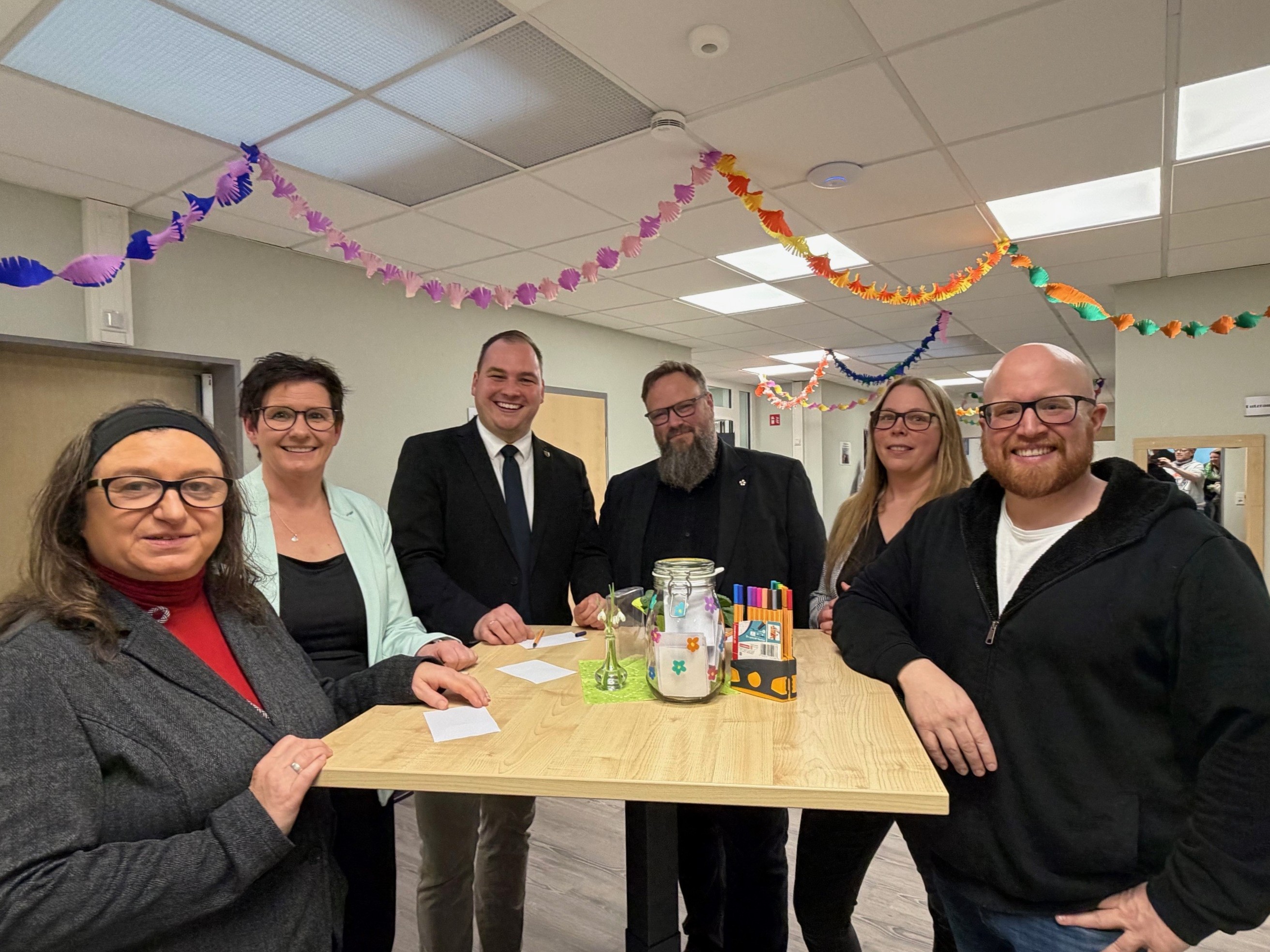 Bild: Ende Februar wurde die neue Kita-Außenstelle Adlerstraße des Kinderhauses Kunterbunt im Beisein der Projektbeteiligten feierlich eingeweiht. Über den schnellen Umbau freuen sich v. l. Petra Georg (Stadtverwaltung), Dagmar Kettner-Siebert (Kita-Leitung Kinderhaus Kunterbunt), Bürgermeister Lukas Winkler, Pfarrer Martin Slenczka , Marion Bäcker (stellv. Kita-Leitung Kita-Außenstelle Adlerstraße), und Peter Kessler (Stellv. Kita-Leitung Kinderhauses Kunterbunt).