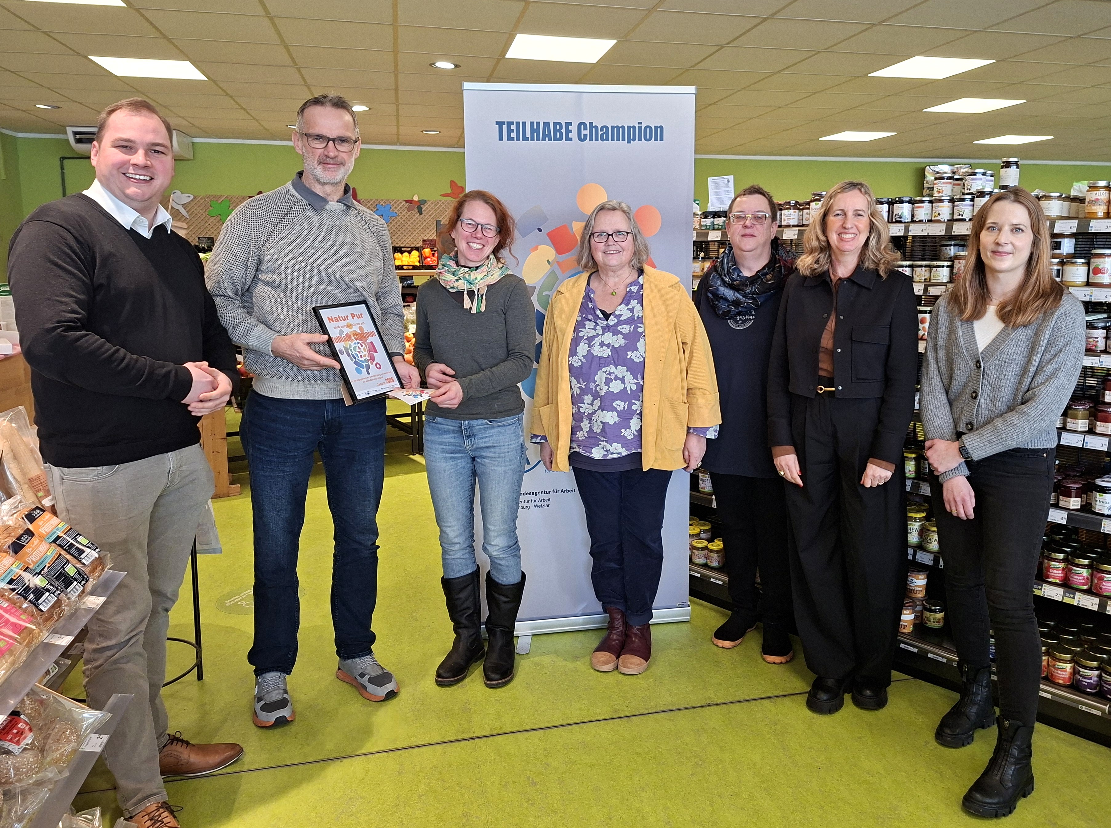 Bildunterschrift: Der Titel „Teilhabechampion“ würdigt monatlich Unternehmen, die sich in besonderem Maße für eine inklusive, vielfältige und chancengerechte Arbeitswelt einsetzen. Im Januar 2026 wurde die Auszeichnung an Natur Pur verliehen. v. l. n. r.: Lukas Winkler, Dirk Köhler, Nicole Besserer, Monika Mundt, Susanne Eiben, Claudia Wagner, Jessica Schaaf. Foto: Lahn-Dill-Kreis