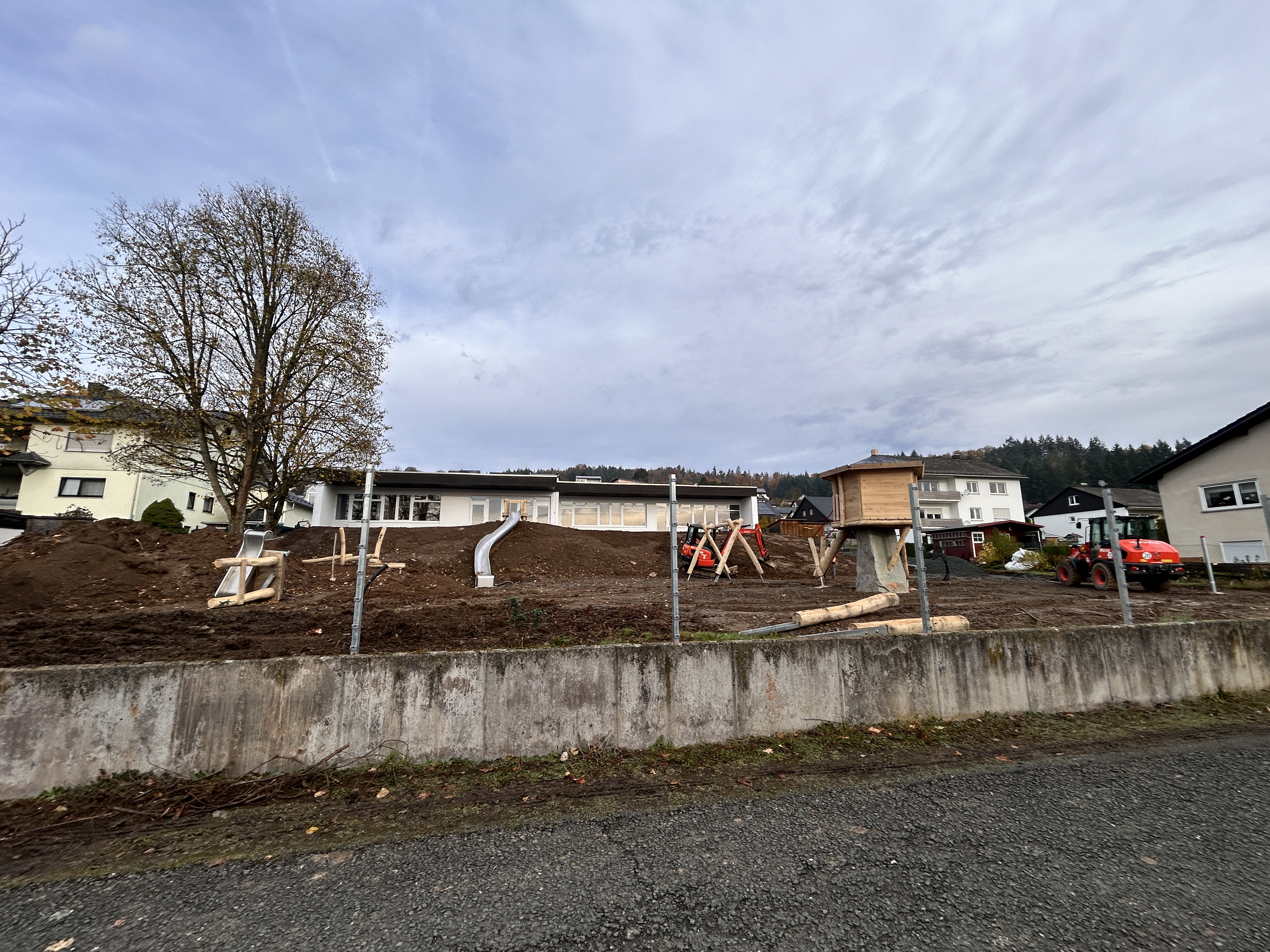 Doch nicht nur im Innern der Kita ist Vieles neu, auch das Außengelände wird kindgerecht umgestaltet. Hier entstehen aktuell ein Kletterturm mit echtem Hinkelstein, Schaukeln, eine große Rutsche sowie Spielgeräte für Kinder unter drei Jahren. Etwas später wird auch eine Hütte aufgebaut, die der geplanten Naturgruppe, die zu einem späteren Zeitpunkt ins Leben gerufen wird, als Refugium dienen soll.