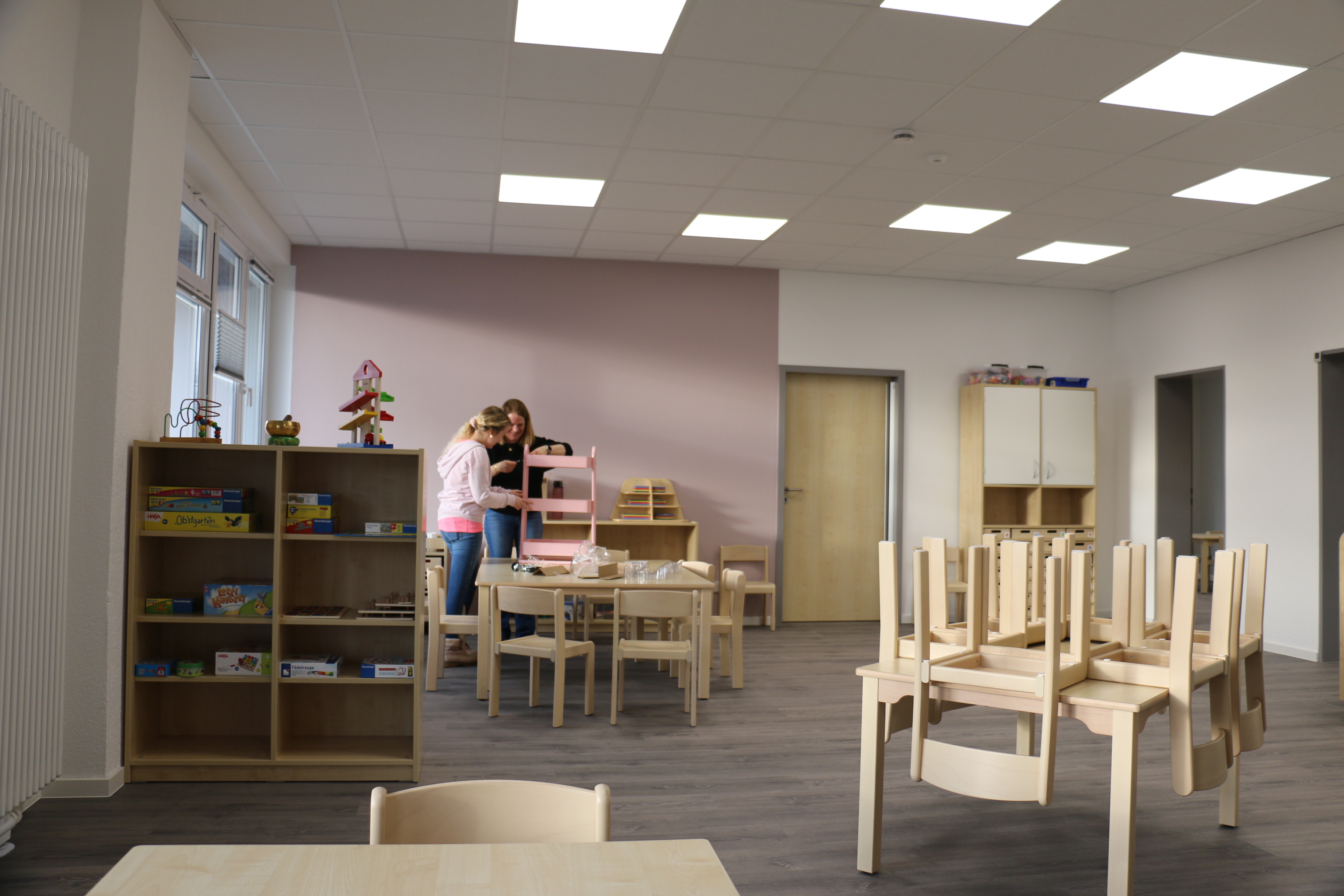 Seit dem 1. Oktober bereiten sieben erfahrene pädagogische Fachkräfte, als neues Team, alles für den Start vor. Liebevoll wurden Möbel, Bücher und Spiele ausgewählt, täglich treffen neue Lieferungen ein – Stück für Stück füllen sich die Räume mit Leben. Dagmar Kettner-Siebert vom Leitungsteam betont: „Besonders zu danken ist allen Beteiligten, die den schnellen Umbau ermöglicht haben: Neben den ausführenden Firmen, den Beteiligten im Fachdienst Hochbau, dem Fachdienst Kinder, Jugend und Familien, dem Baubetriebshof, dem Fachdienst Allgemeine Verwaltung und vor allem dem gesamten Team der Kita Kunterbunt, das in den vergangenen Wochen viel aufgefangen hat“.